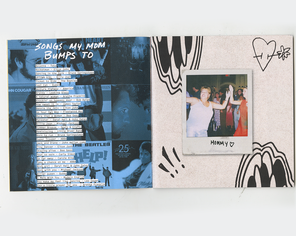 This project is a collection of playlists that I curated for different times in my life. I wanted to convey a feeling of nostalgia and give whoever is interacting with this zine a feel for each playlist through the imagery that I chose.